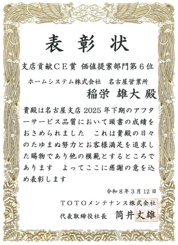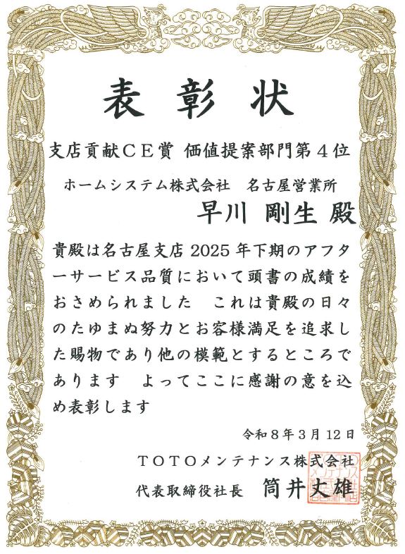 「TOTOメンテナンス 2025年下期 支店貢献CE賞」価値提案部門にて 第4位・第5位・第6位を受賞しました! 新着情報 2026.03.26 この度、弊社社員がTOTOメンテナンス名古屋支店エリアにおいて 「2025年下期 支店貢献CE賞」価値提案部門にて第4位・第5位・第6位を受賞いたしました。 今後とも、皆さまに「こぼれるまでサービス®」をお届けして参ります。 より一層のご支援、お引き立てを賜りますようお願い申し上げます。